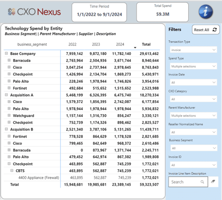 CXO Nexus was able to provide a consolidated view in weeks via their SaaS CIO InCight. We sent multiple files from various ERP and Sourcing system providers that CXO Nexus was able to scrub, enrich, and load up to a secure dashboard. We did not have the resources to manually combine and cleanse the workable data to identify what InCight delivers out of the box.