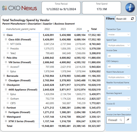 Case in point, a wildcard Firewall search identified spend was comprised of six redundant purchasing technologies (Cisco, Palo Alto, Barracuda, Checkpoint, Fortinet, and WatchGuard). Via InCight we have the complete, real-time visibility into our vendor spend, how purchased (direct or indirect), by Cost Center, and Business Entity.”