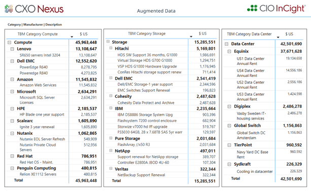 The example above highlights spend in the Compute, Storage and Data Center Categories. Derived from querying the Augmented Data created by the CIO InCight AI & ML engine, the industry standard for automated and repeatable visibility into Vendor spend. No client FTEs are required to process data and our service is compatible with all financial systems.